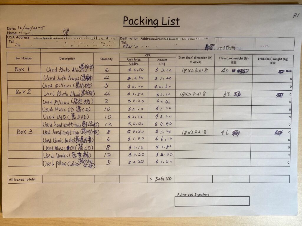 如果你不知道怎麼使用電腦或是Excel嗎? 這也沒問題,我剛剛說我們有一條龍服務就是有一條龍服務! 梁先生她當時沒有電腦在身,只有手機。所以他把檔案印出來用手寫,我們這邊也可以幫您把Packing List寫好唷! 很棒的服務吧!