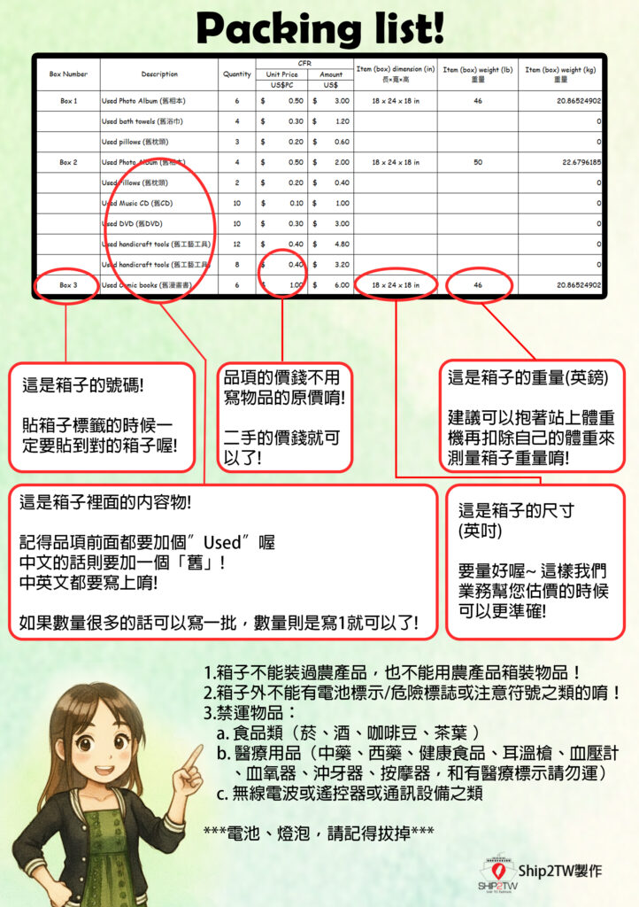 首先您需要把要運送回台灣的物品都裝箱打包好,每個箱子都要有箱子的號碼唷! 也要把箱子裡面的東西記錄下來填寫好給我們這邊做報關的處理。這個表格就叫做Packing List! 不知道怎麼填寫嗎? 沒問題! 我這裡有教學唷!