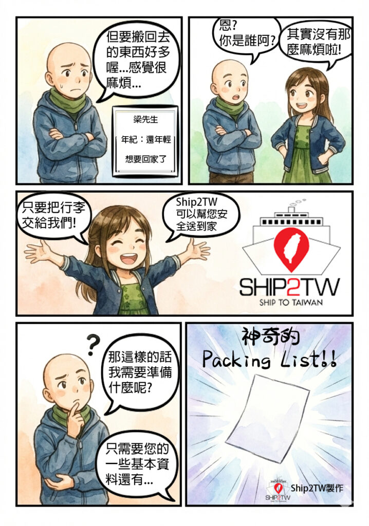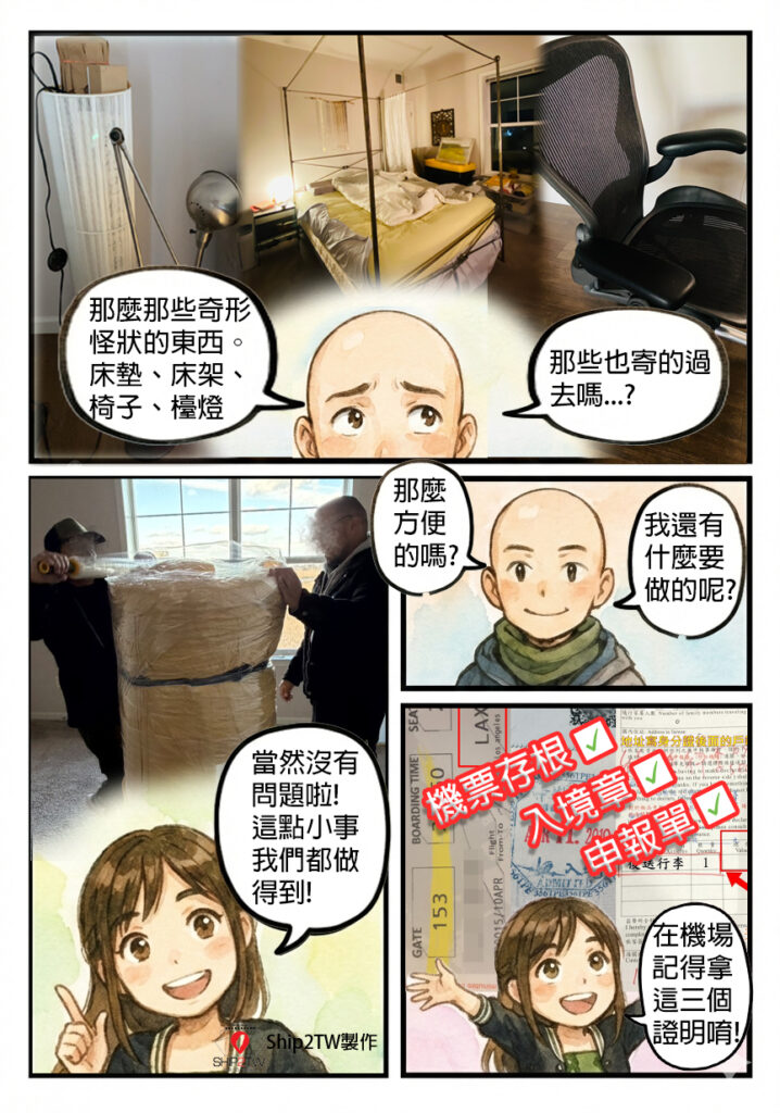跟我們的小漫畫裡面一樣,梁先生他有很多想要帶回台灣的家具。床睡久了會認床,椅坐久了會認椅,這些都是個宇宙的一個奇怪小定律。一起帶著走也都不奇怪! 這些我們Ship2TW都可以幫您解決的呢! 從打包到運送,全部的過程我們都會很專業的幫您處理好!